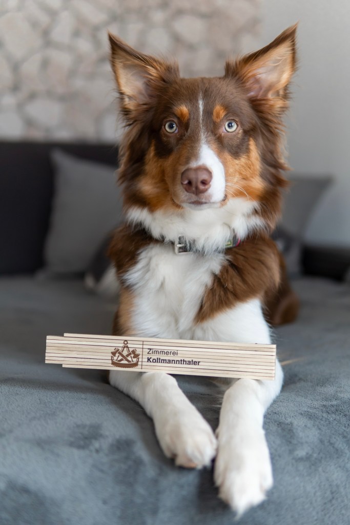 Amy, eine fröhliche und lebhafte Aussie-Hündin, ist das Maskottchen der Zimmerei und sowohl bei Kunden als auch bei Mitarbeitern gern gesehen! Sie hat eine große Leidenschaft für Holz entwickelt und freut sich jedes Mal, wenn Sie beim Aufräumen von Holzlatten mit anpacken darf!